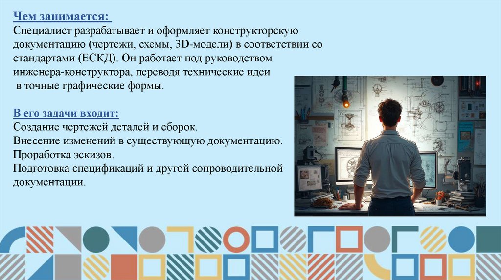 Чем занимается:Специалист разрабатывает и оформляет конструкторскую