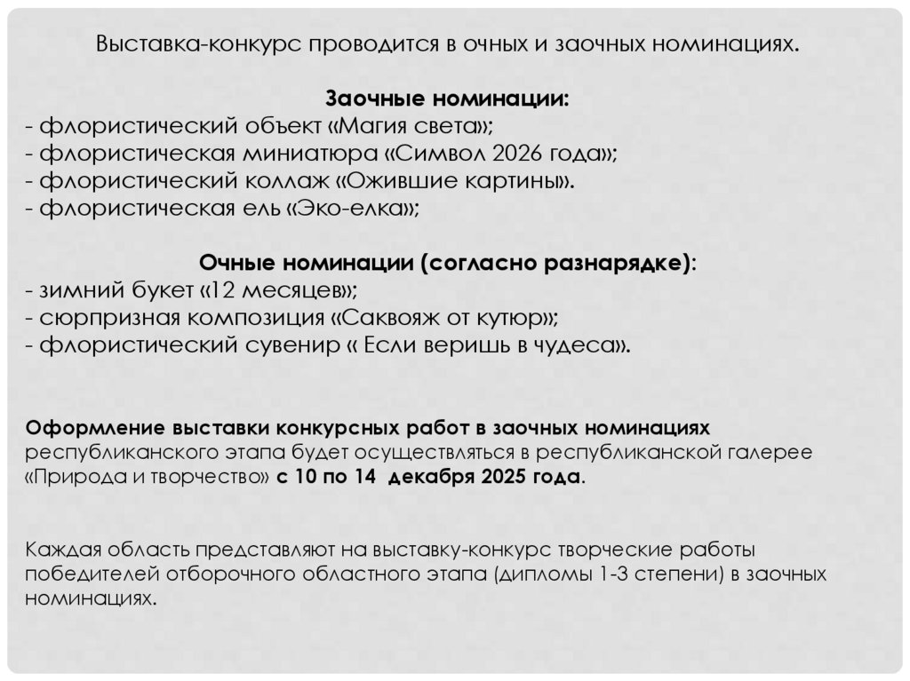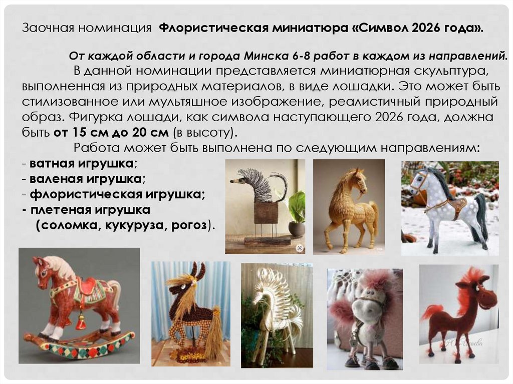 Заочная номинация Флористическая миниатюра «Символ 2026 года».От каждой области и города Минска 6-8 работ в каждом из направлений.