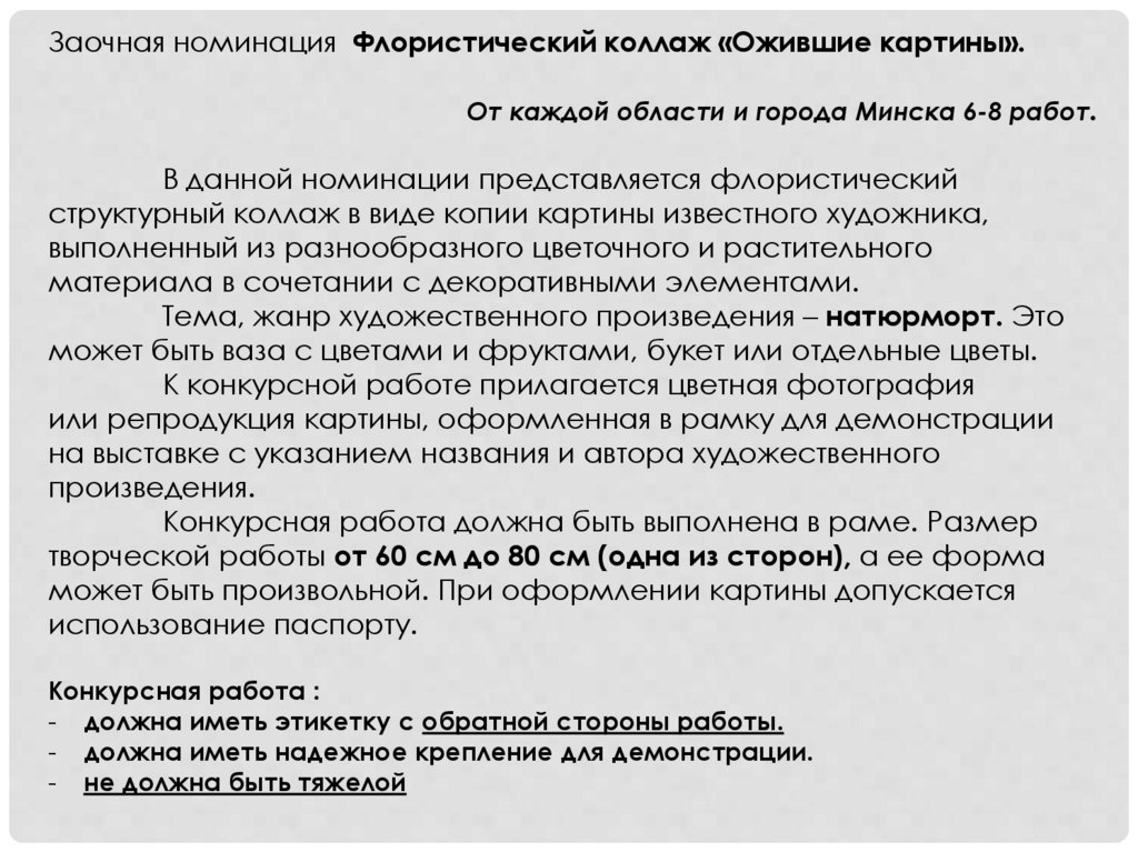 Заочная номинация Флористический коллаж «Ожившие картины».От каждой области и города Минска 6-8 работ.