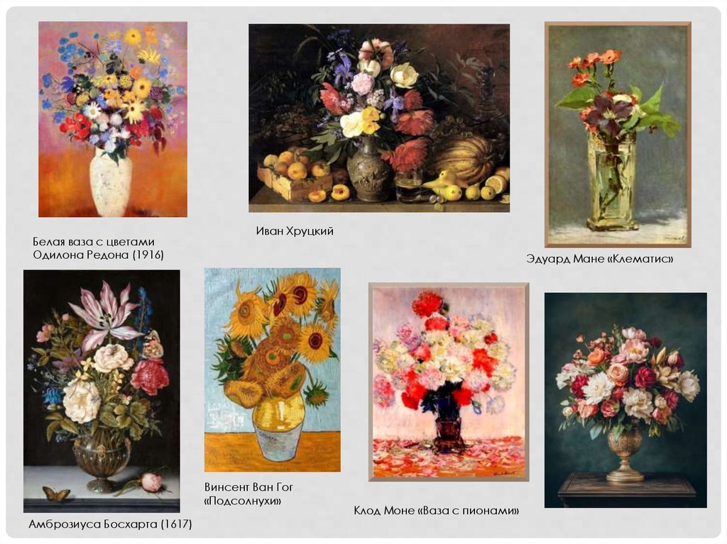 может быть ваза с цветами и фруктами, букет или отдельные цветы.
