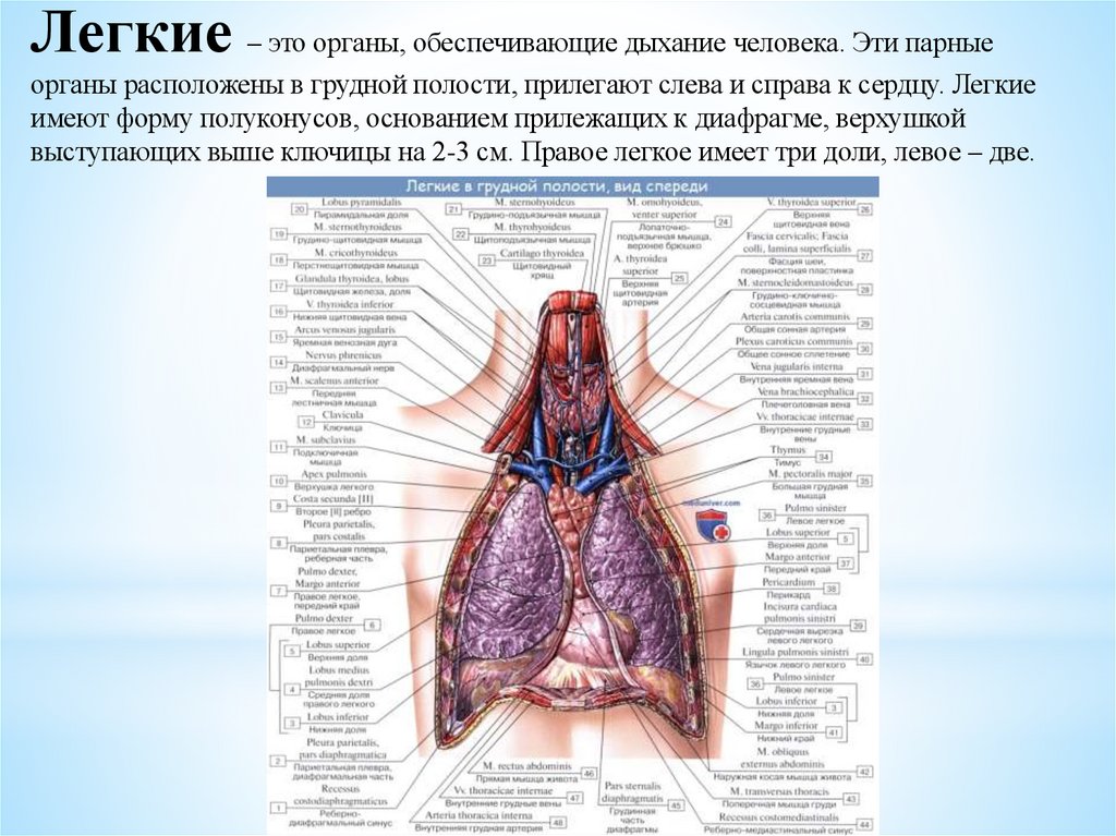 Легкие – это органы, обеспечивающие дыхание человека. Эти парныеорганы расположены в грудной полости, прилегают слева и справа к сердцу. Легкие