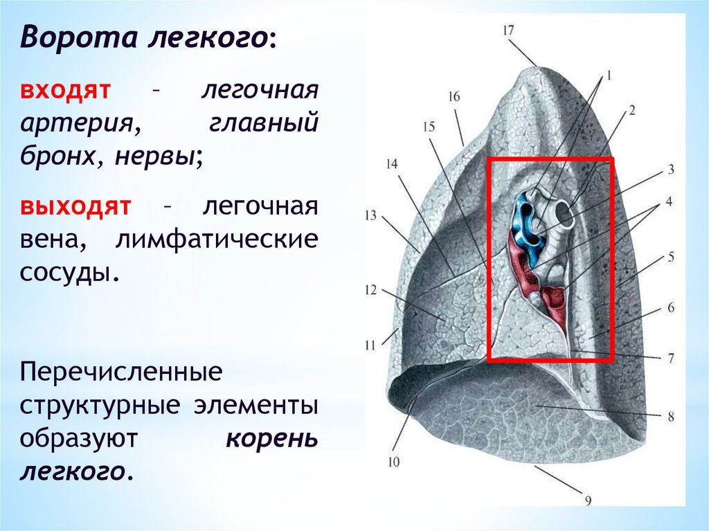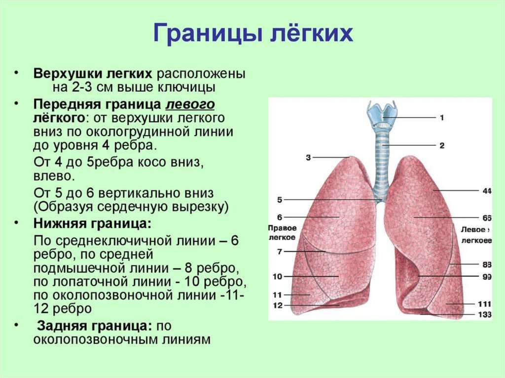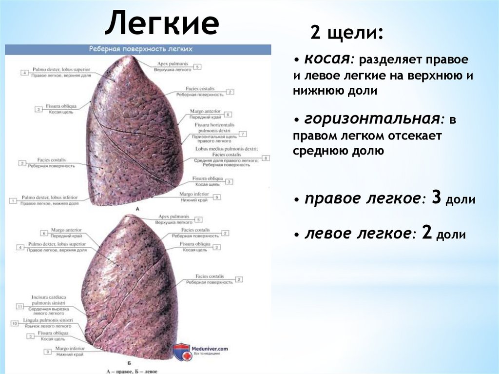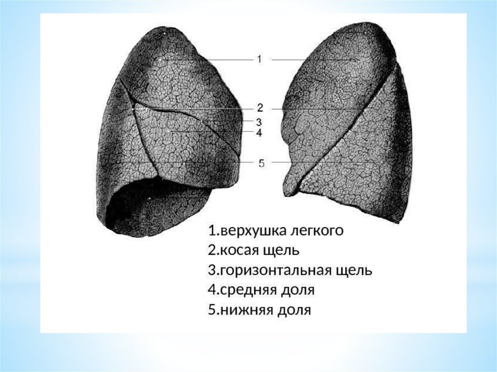 выступающих выше ключицы на 2-3 см. Правое легкое имеет три доли, левое – две.