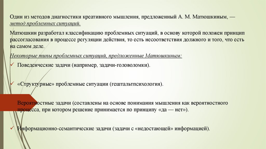 Один из методов диагностики креативного мышления, предложенный А. М. Матюшкиным, —метод проблемных ситуаций.