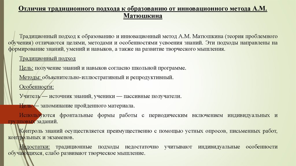 Традиционный подход к образованию и инновационный метод А.М. Матюшкина (теория проблемного