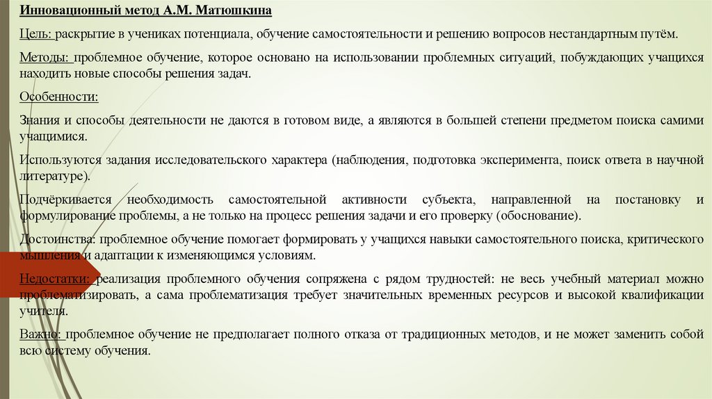 Инновационный метод А.М. МатюшкинаЦель: раскрытие в учениках потенциала, обучение самостоятельности и решению вопросов нестандартным путём.
