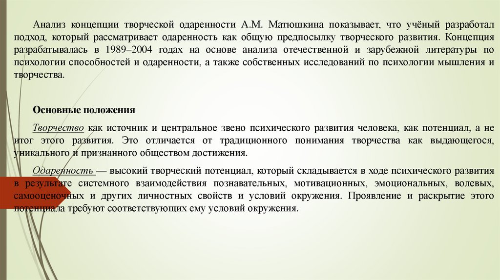 Анализ концепции творческой одаренности А.М. Матюшкина показывает, что учёный разработалподход, который рассматривает одаренность как общую предпосылку творческого развития. Концепция