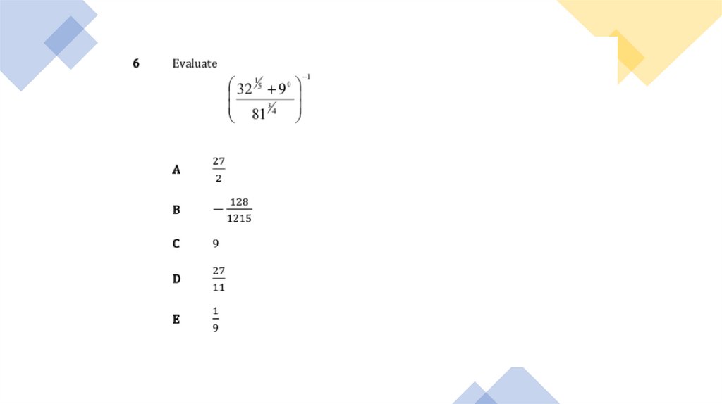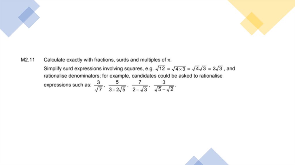 • M2.7 Use index laws to simplify numerical expressions, and for multiplication anddivision of integer, fractional and negative powers.