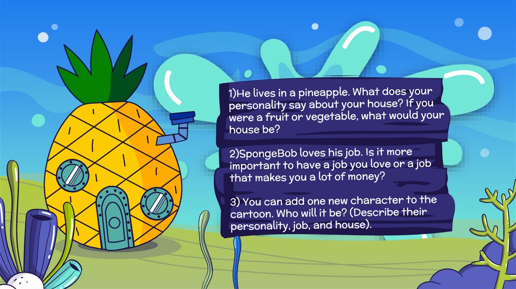 4. 1) if you visit Bikini Bottom for one day, what will you do? 2) Who is your favorite character? Why? 3) SpongeBob is always