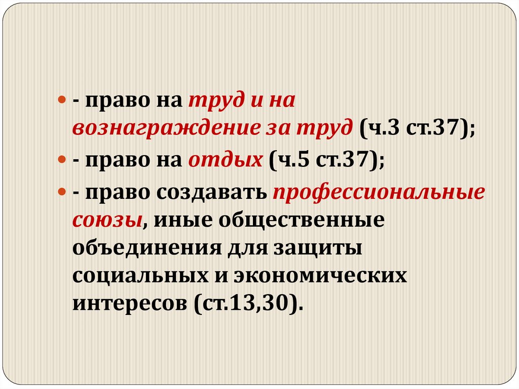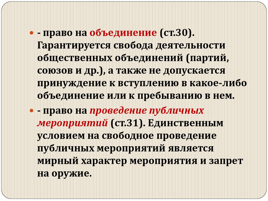 - право на объединение (ст.30).Гарантируется свобода деятельности