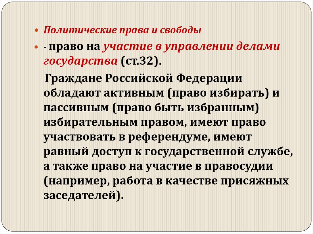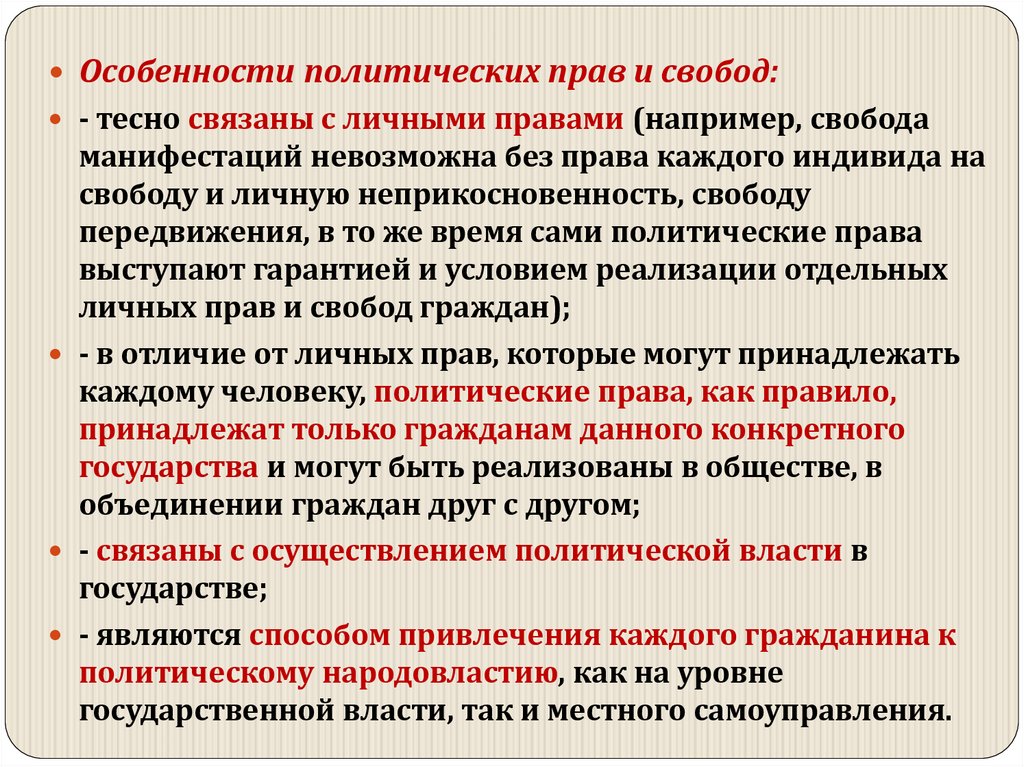 Особенности политических прав и свобод:- тесно связаны с личными правами (например, свобода