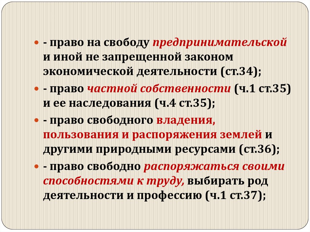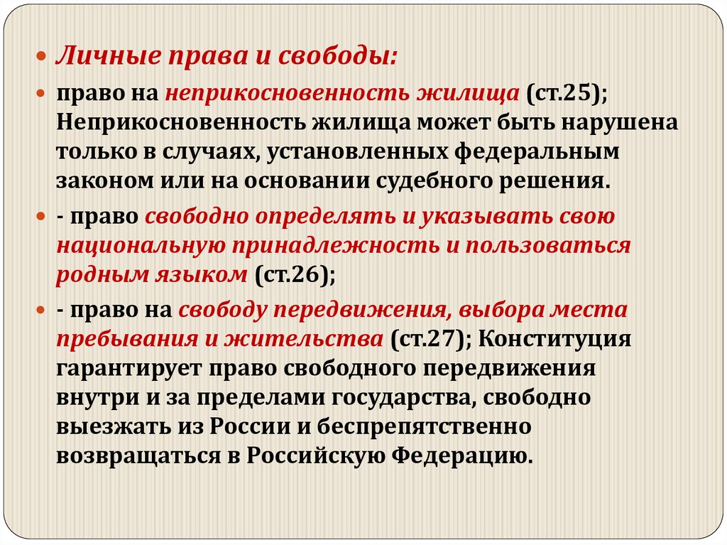 Личные права и свободы:право на неприкосновенность жилища (ст.25);