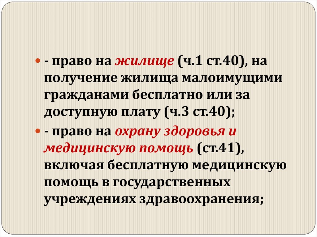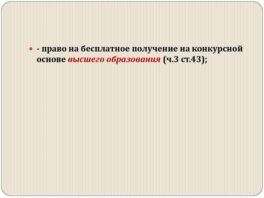 - право на бесплатное получение на конкурснойоснове высшего образования (ч.3 ст.43);