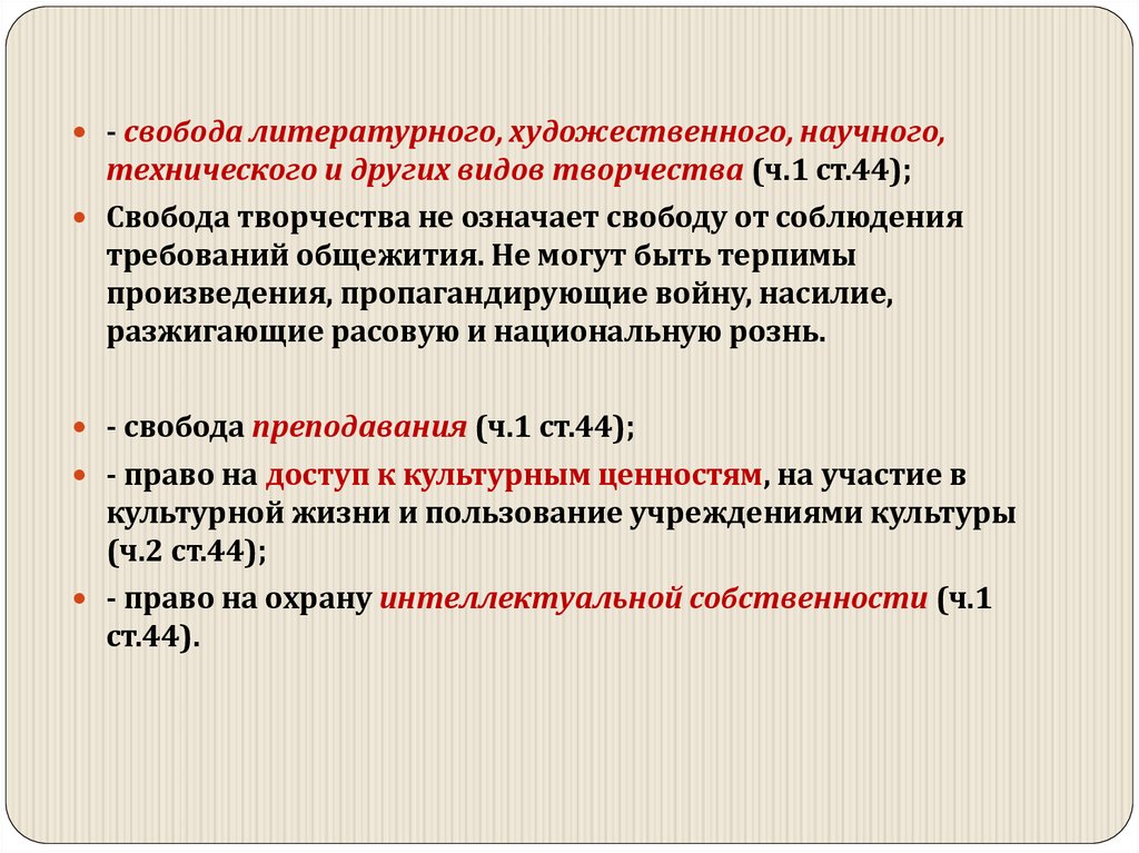 - свобода литературного, художественного, научного,технического и других видов творчества (ч.1 ст.44);
