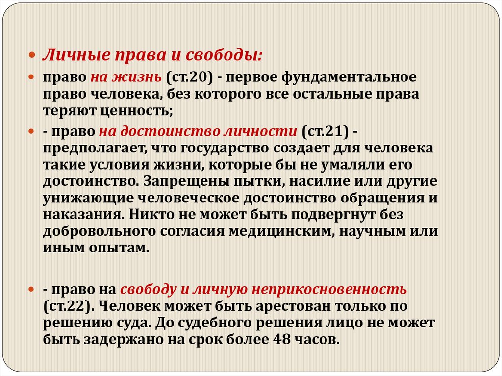 Личные права и свободы:право на жизнь (ст.20) - первое фундаментальное