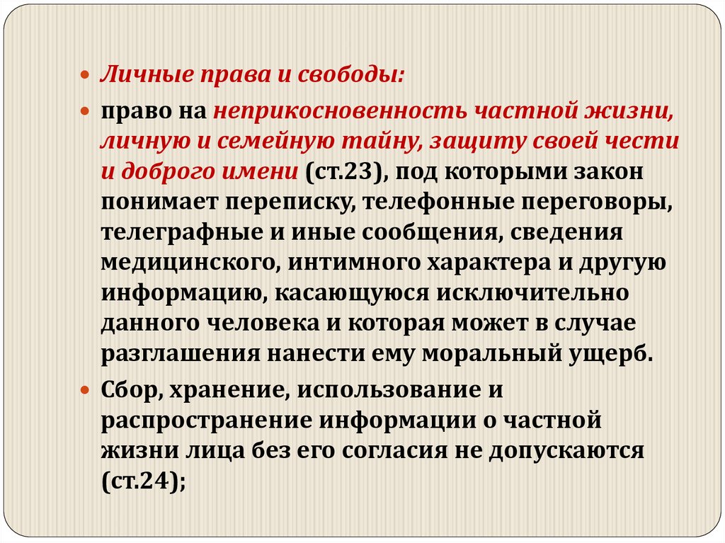 Личные права и свободы:право на неприкосновенность частной жизни,