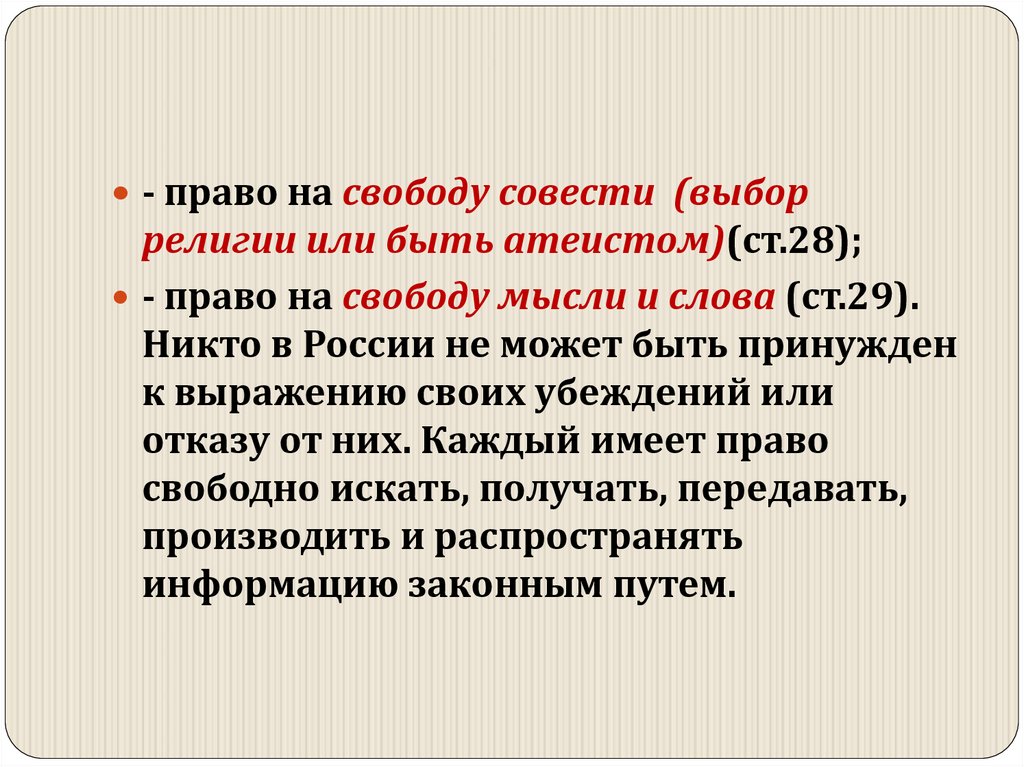 - право на свободу совести (выборрелигии или быть атеистом)(ст.28);