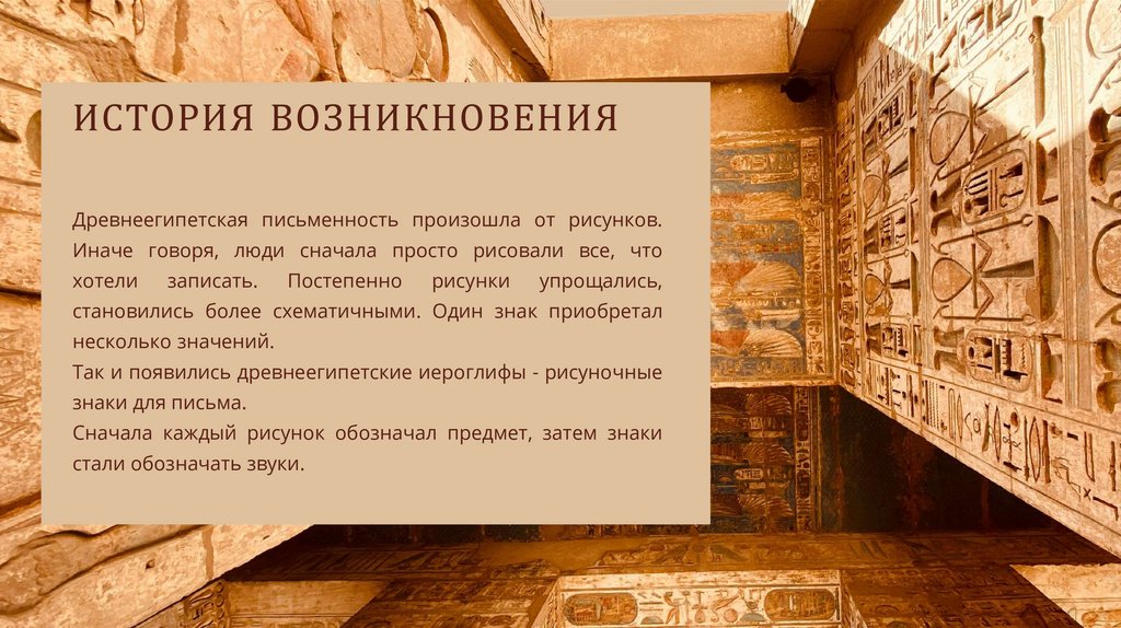 ИСТОРИЯ ВОЗНИКНОВЕНИЯДревнеегипетская письменность произошла от рисунков.