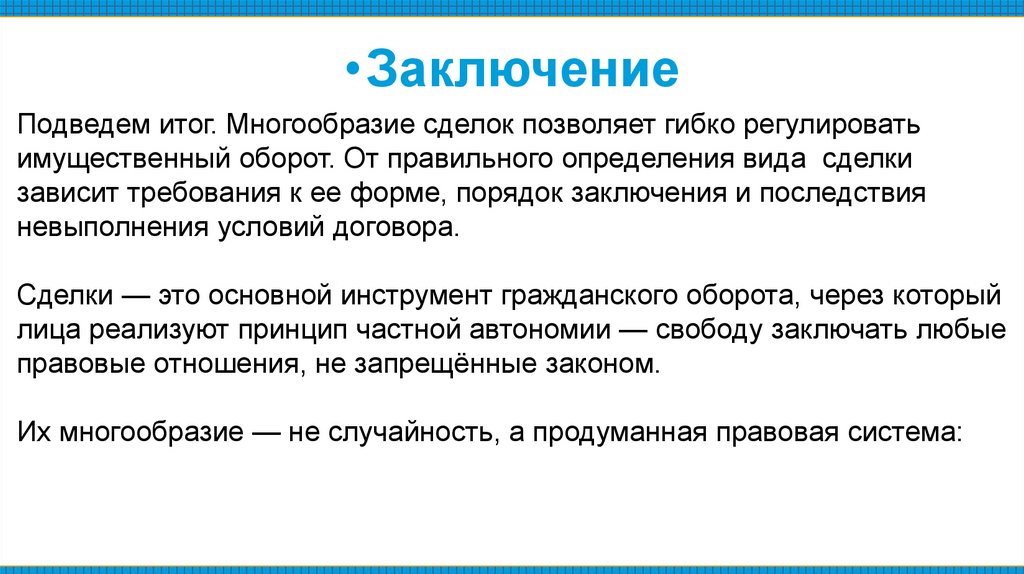 • ЗаключениеПодведем итог. Многообразие сделок позволяет гибко регулировать