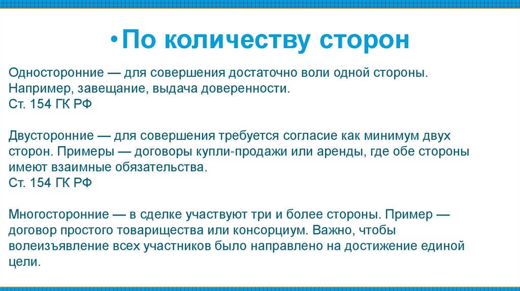 • По количеству сторонОдносторонние — для совершения достаточно воли одной стороны.