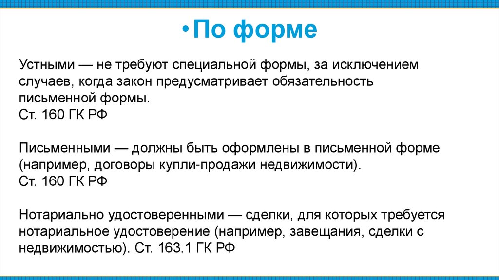 Каждый вид сделки (односторонняя, реальная, нотариальная,безвозмездная и т.д.) имеет специфические правила, направленные