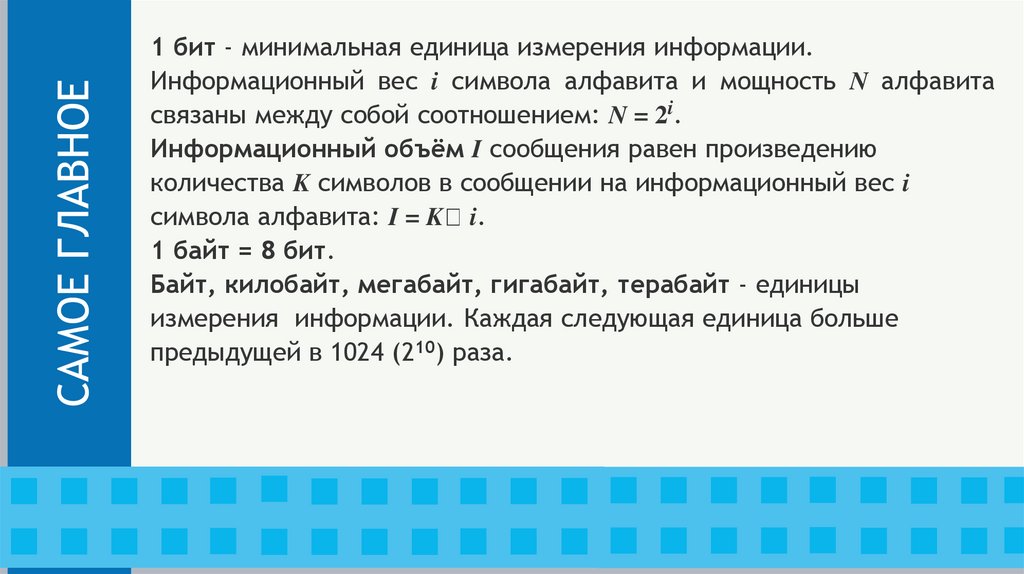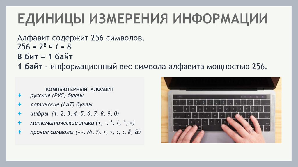ЕДИНИЦЫ ИЗМЕРЕНИЯ ИНФОРМАЦИИАлфавит содержит 256 символов.