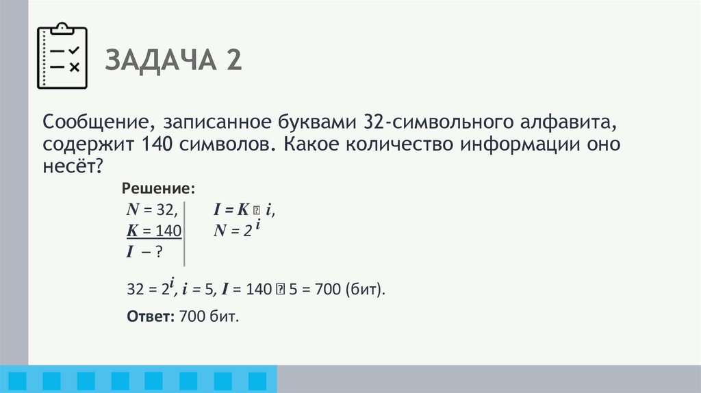 32 = 2i, i = 5, I = 140 5 = 700 (бит).