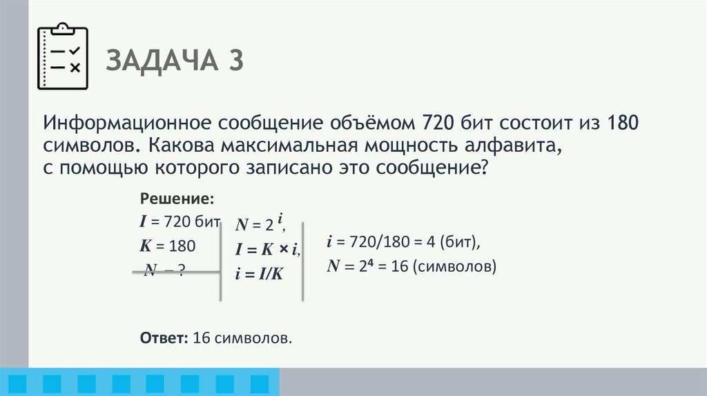 ЗАДАЧА 3Информационное сообщение объёмом 720 бит состоит из 180