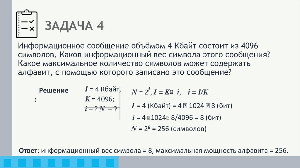 ЗАДАЧА 4Информационное сообщение объёмом 4 Кбайт состоит из 4096