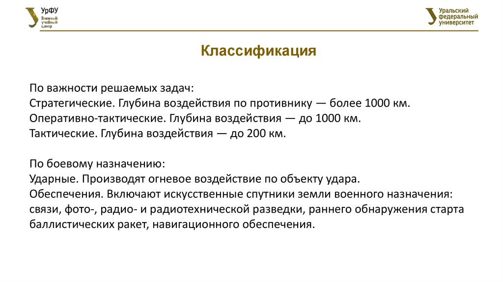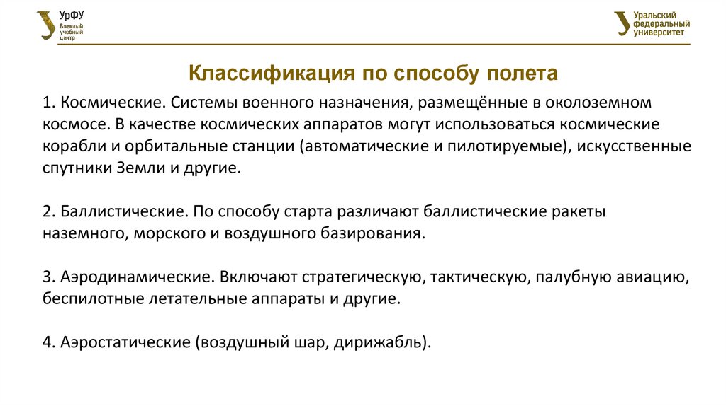Классификация по способу полета1. Космические. Системы военного назначения, размещённые в околоземном