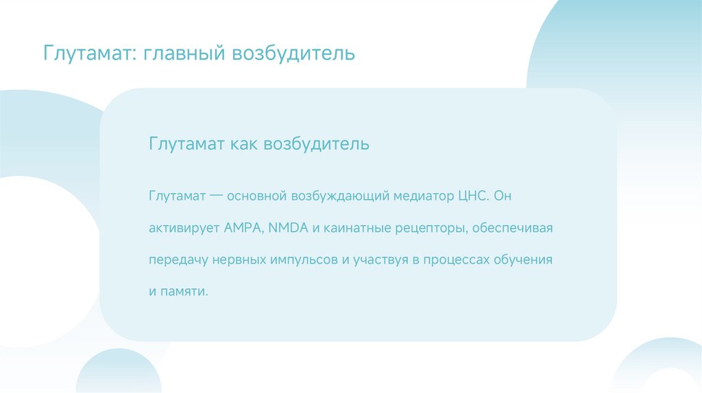 Глутамат — основной возбуждающий медиатор ЦНС. Он