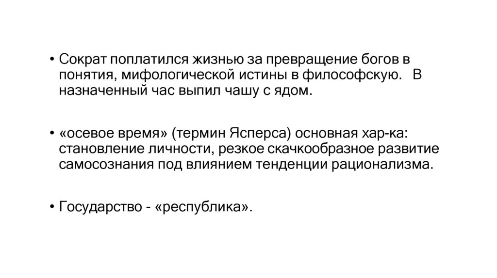 • Сократ поплатился жизнью за превращение богов впонятия, мифологической истины в философскую. В