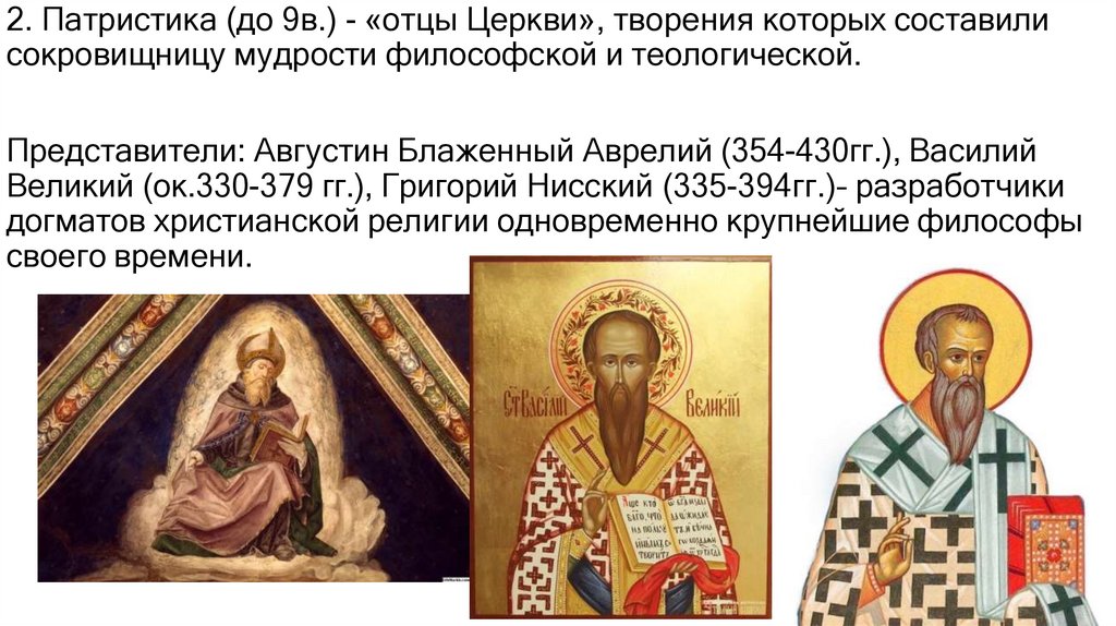 2. Патристика (до 9в.) - «отцы Церкви», творения которых составилисокровищницу мудрости философской и теологической.