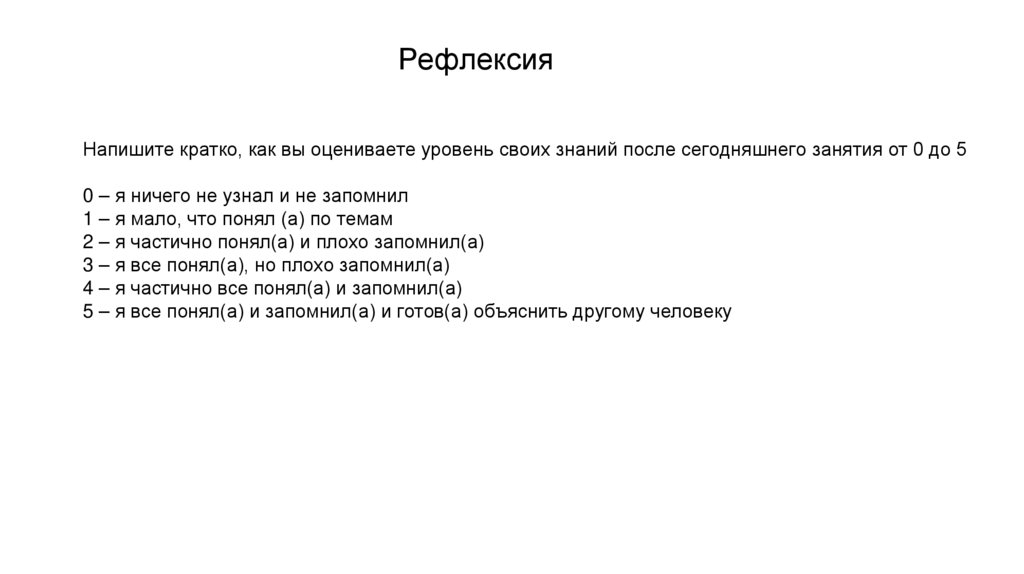 РефлексияНапишите кратко, как вы оцениваете уровень своих знаний после сегодняшнего занятия от 0 до 5
