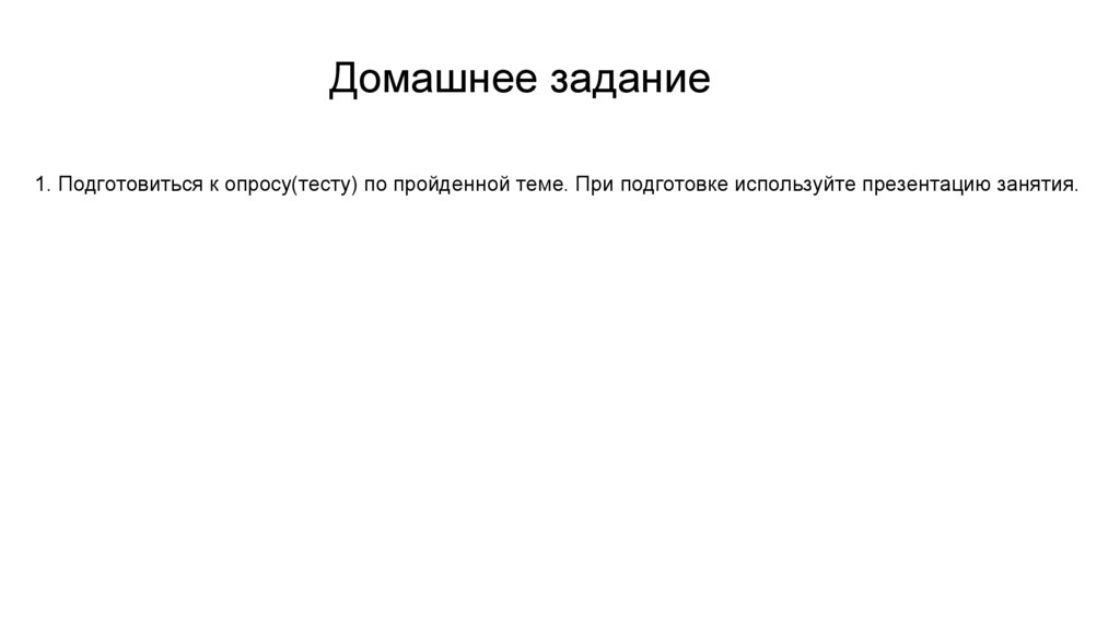Домашнее задание1. Подготовиться к опросу(тесту) по пройденной теме. При подготовке используйте презентацию занятия.