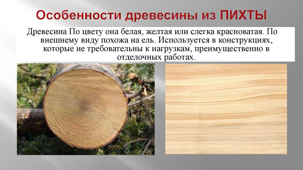 Древесина По цвету она белая, желтая или слегка красноватая. Повнешнему виду похожа на ель. Используется в конструкциях,