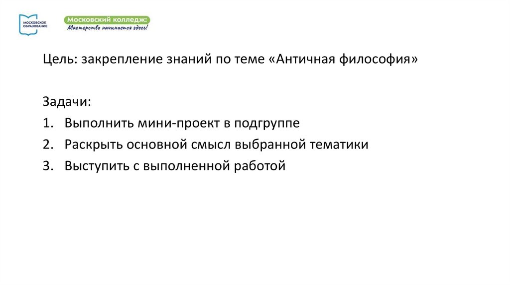 Цель: закрепление знаний по теме «Античная философия»Задачи: