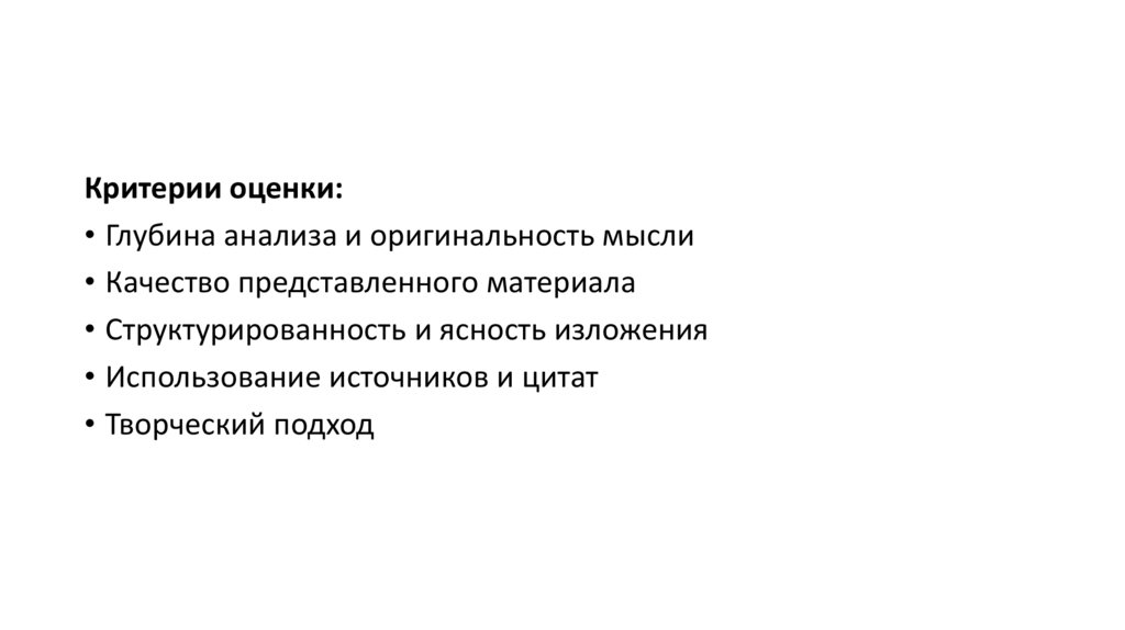 Критерии оценки:• Глубина анализа и оригинальность мысли