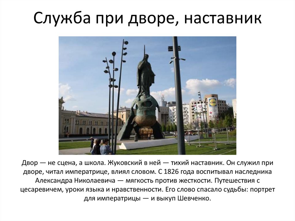 Служба при дворе, наставникДвор — не сцена, а школа. Жуковский в ней — тихий наставник. Он служил при