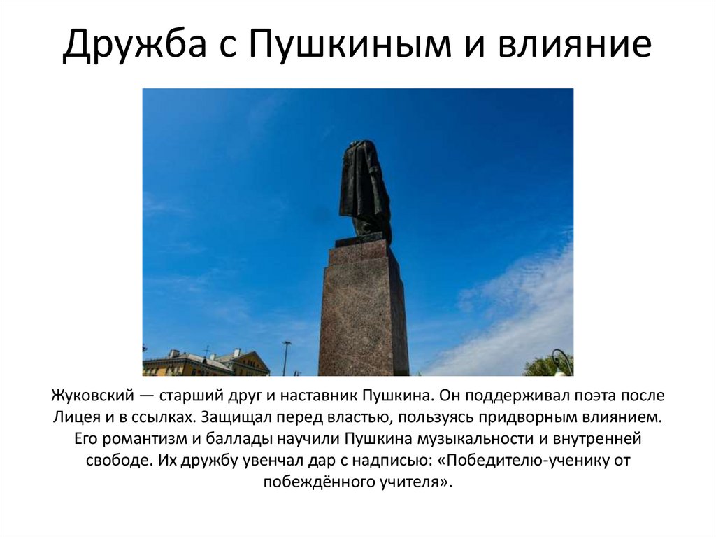 Дружба с Пушкиным и влияниеЖуковский — старший друг и наставник Пушкина. Он поддерживал поэта после