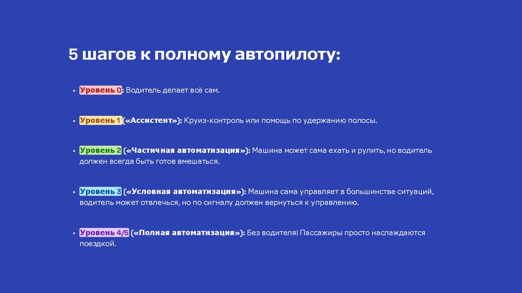 5 шагов к полному автопилоту:• Уровень 0: Водитель делает всё сам.
