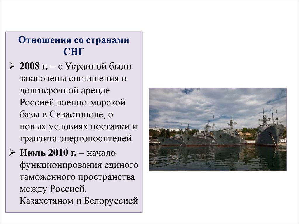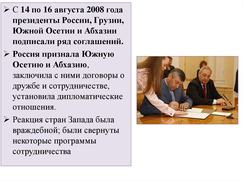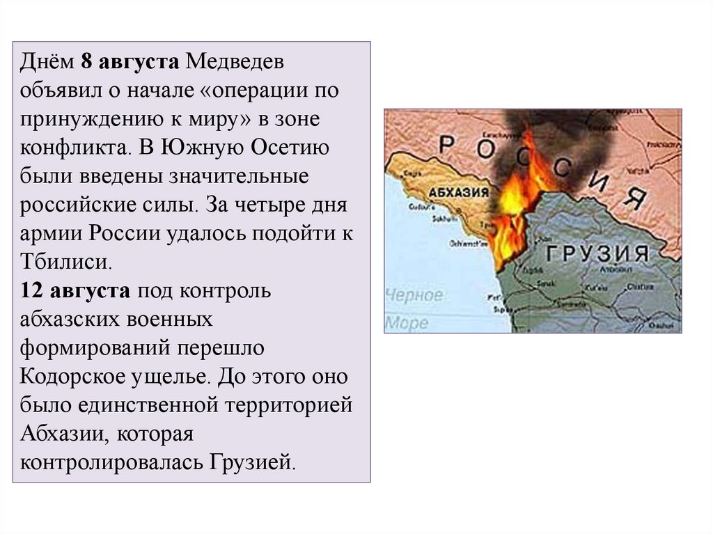 9. Август 2008 г. – вооруженный конфликт в Южной Осетии. ИТОГ: 1) поражение грузинских войск; 2) Россия признала Абхазию и Южную