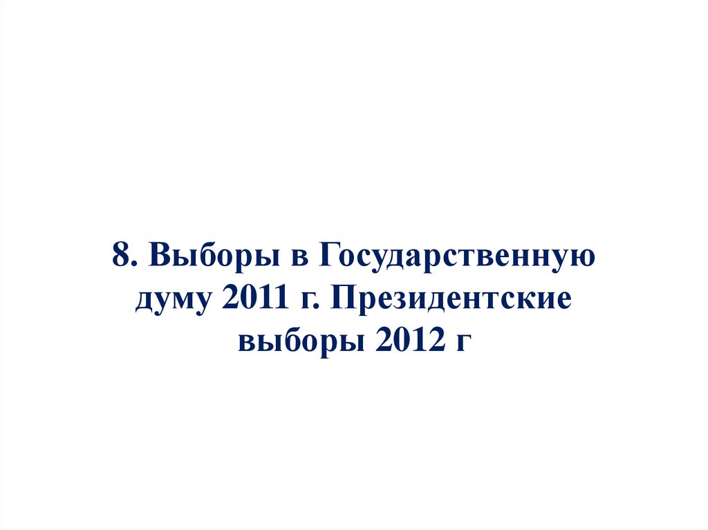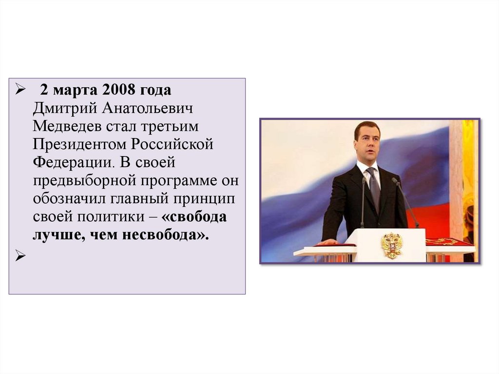 6. 2 марта 2008 г. – избрание Президентом РФ Д. А. Медведева. Премьер-министр – В. В. Путин.