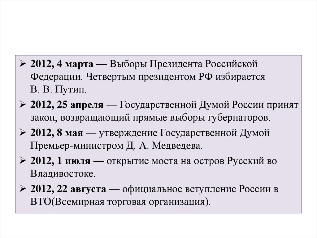 2012, 4 марта — Выборы Президента РоссийскойФедерации. Четвертым президентом РФ избирается