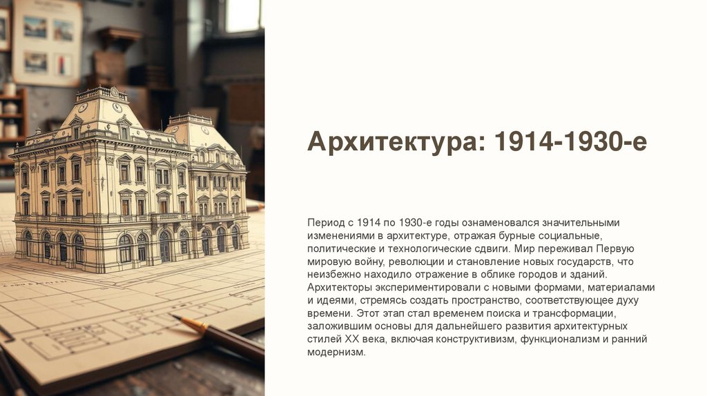 Архитектура: 1914-1930-еПериод с 1914 по 1930-е годы ознаменовался значительными