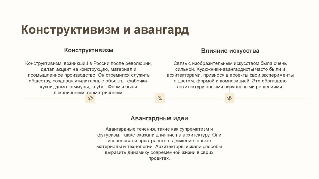 Конструктивизм стал доминирующим направлением. Его отличали строгие геометрические формы,