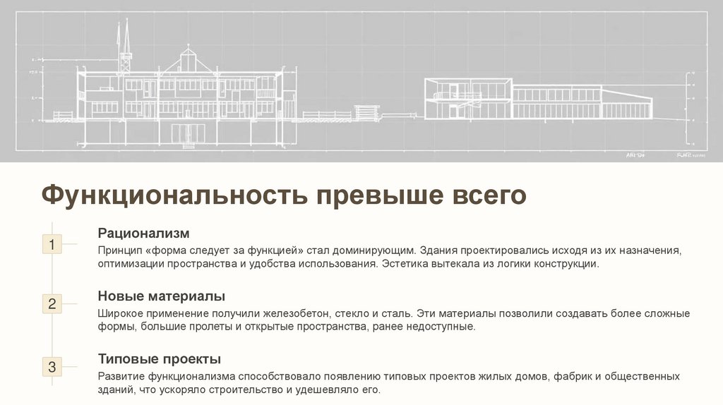 Развитие функционализма способствовало появлению типовых проектов жилых домов, фабрик и общественных