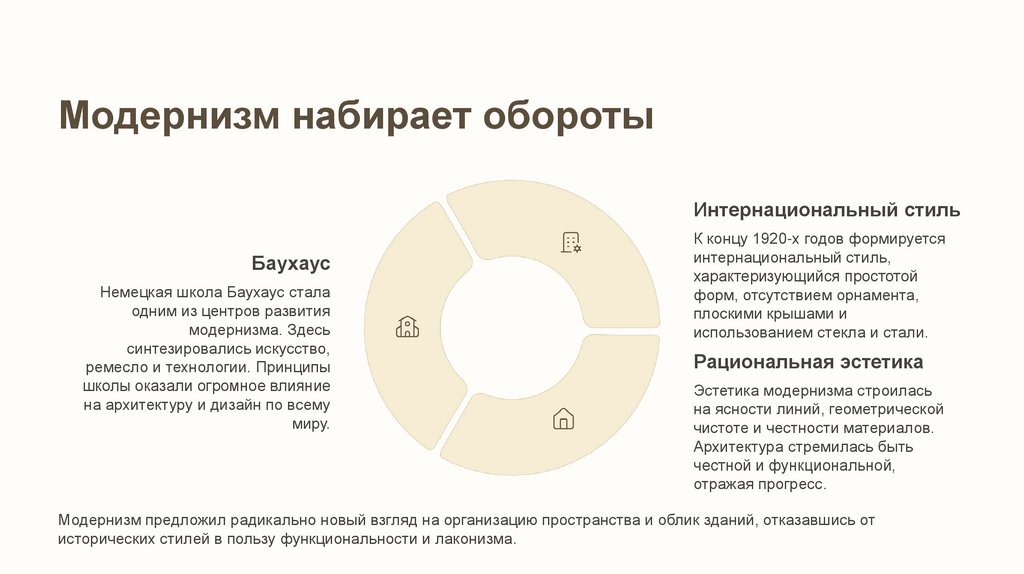 Модернизм предложил радикально новый взгляд на организацию пространства и облик зданий, отказавшись от