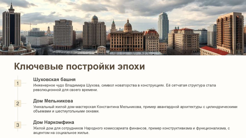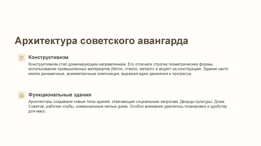 Советов, рабочие клубы, коммунальные жилые дома. Особое внимание уделялось планировке и удобству