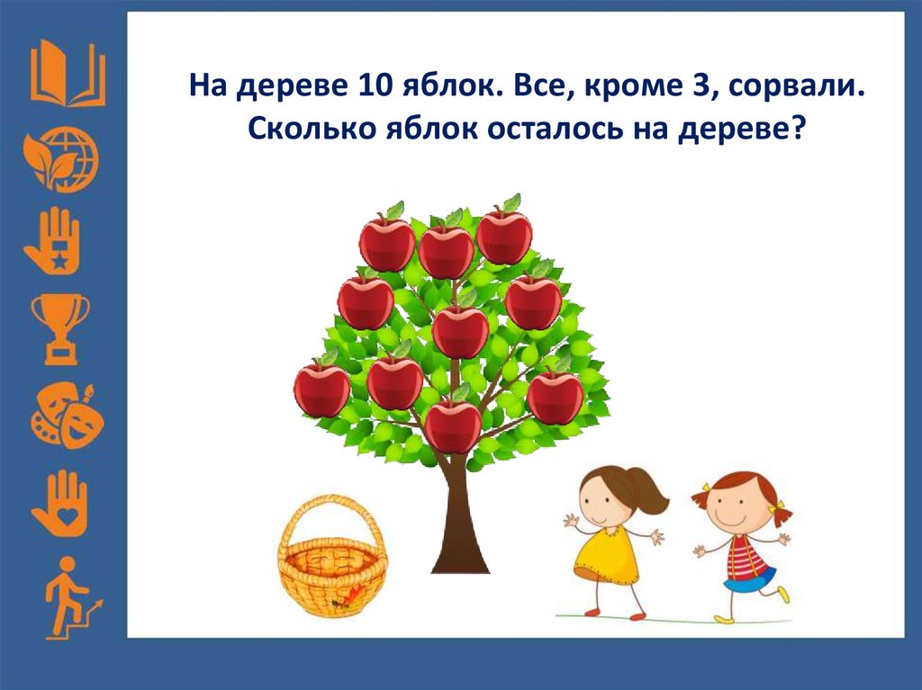 На дереве 10 яблок. Все, кроме 3, сорвали.Сколько яблок осталось на дереве?