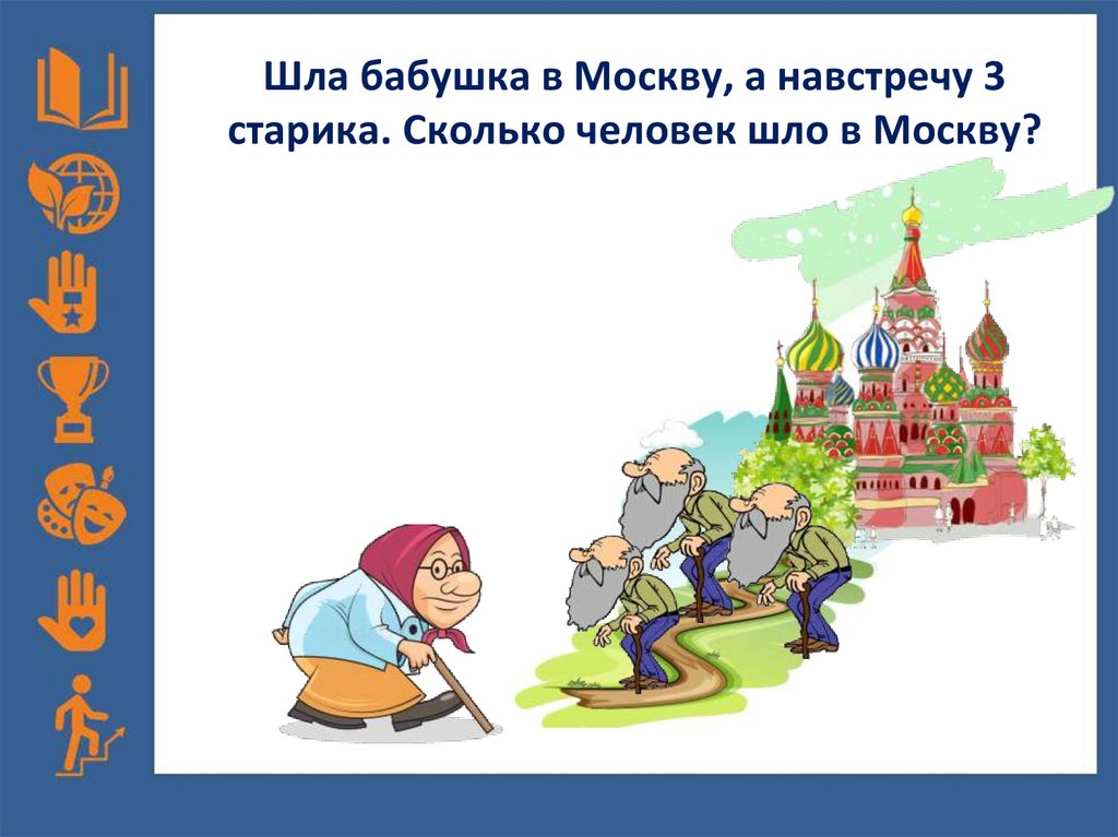 Шла бабушка в Москву, а навстречу 3старика. Сколько человек шло в Москву?